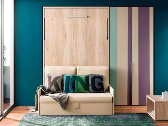 La cama abatible con sofá incorpora un arcón practicable para aprovechar todo el espacio de su interior. Muy práctico para guardar los almohadones. La cama abatible cuando es de profundidad de 60 cm también incorpora en la cabecera un arcón abatible.