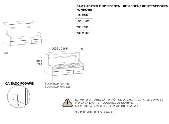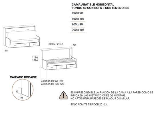 ES IMPRESCINDIBLE FIJAR LA CAMA ABATIBLE EN UNA PARED DE LADRILLO, NO APTAS PARA PAREDES DE PLADUR U OTRO MATERIAL .