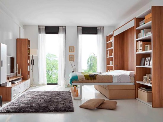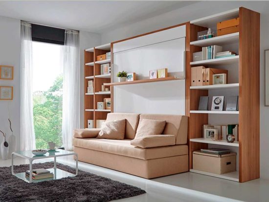 La cama abatible de profundidad 60 cm lleva incorporado estantes interiores, muy prácticos para colocar libros ,el reloj despertador, accesorios…..