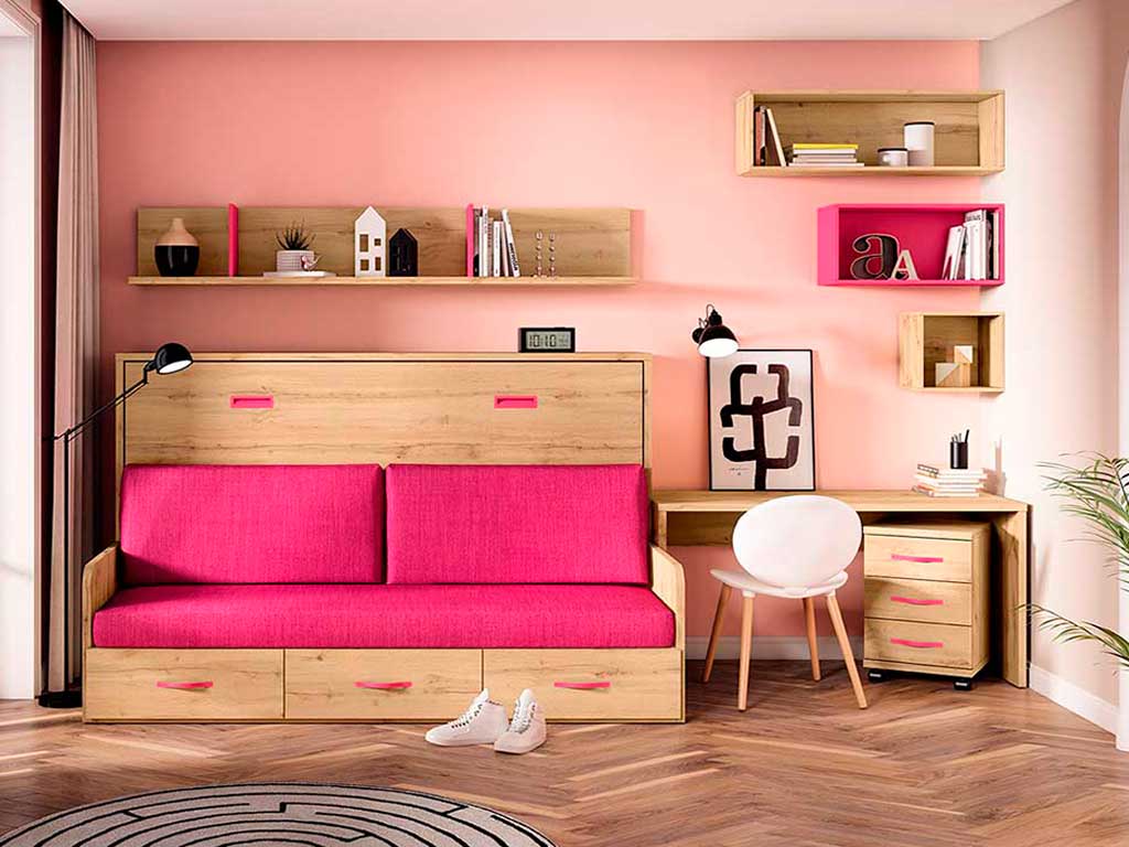 Cama abatible horizontal con sofá OT y cajones inferiores.