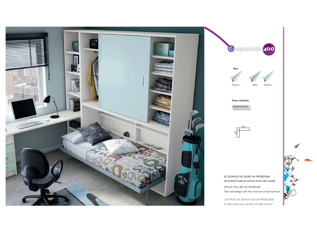 Este sistema abatible nos permite aprovechar nuestra habitación cuando la cama esta plegada y tener un espacio para estudio,juegos…..