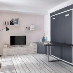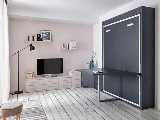 El modelo de cama abatible con mesa es muy práctica a la hora de abrir y cerrar porque al llevar la pata sincronizada no tenemos que manipular ningún sistema de volteo de pata, y simplemente con estirar del la cama se abriría suavemente.