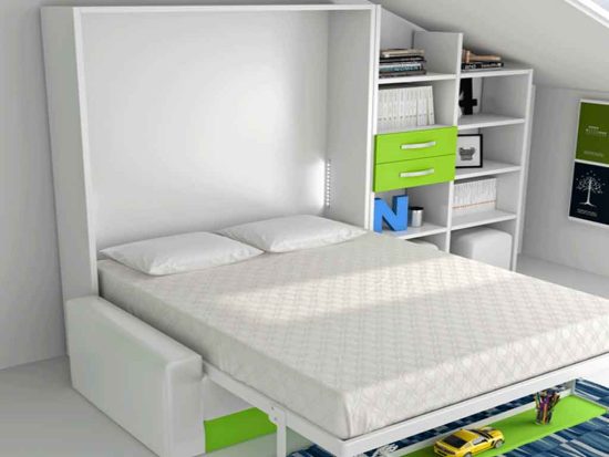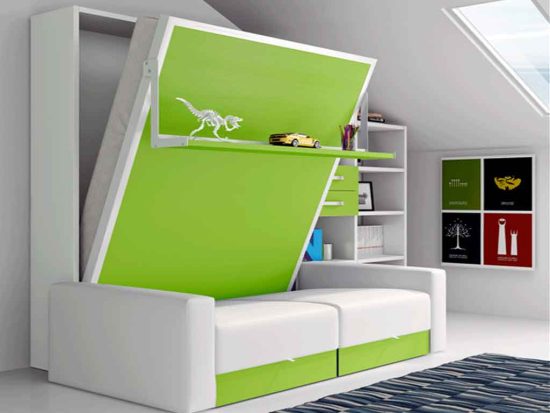 Cama abatible vertical con estante que al mismo tiempo cuando se abate la cama sirve de apoyo. Cada medida de cama abatible tiene su respectivo sofá a medida.