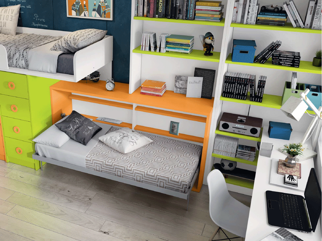 Este sistema abatible nos permite aprovechar nuestra habitación cuando la cama esta plegada y tener un espacio para estudio,juegos…..