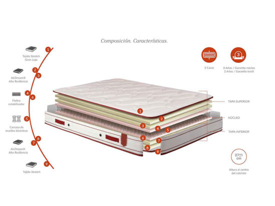 Colchón de muelles, acolchado exclusivo, tejido stretch transpirable y con válvulas para una perfecta ventilación. Asas para transportar y voltear el colchón fácilmente.