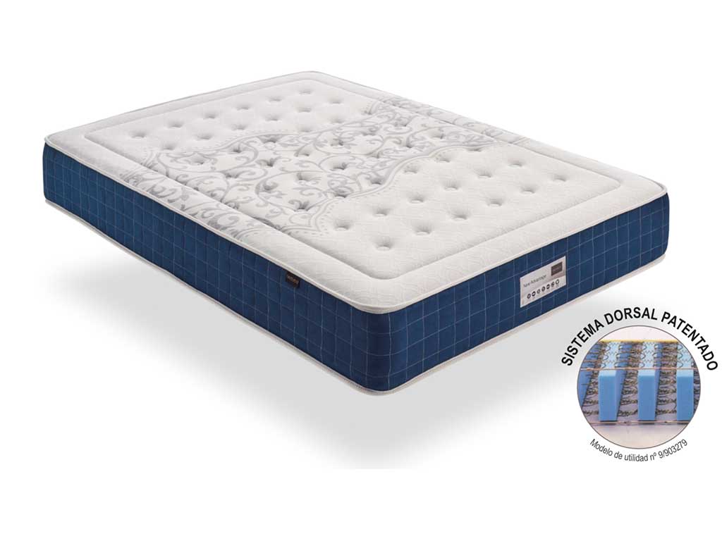 SISTEMA DORSAL PATENTADO. Colchón creado y patentado el SISTEMA DORSAL (modelo de utilidad nº 9/903279) que consiste en la introducción de unas retículas de material esponjoso y flexible, entre los espacios libres de sus filas de muelles consiguiendo una firmeza insuperable.