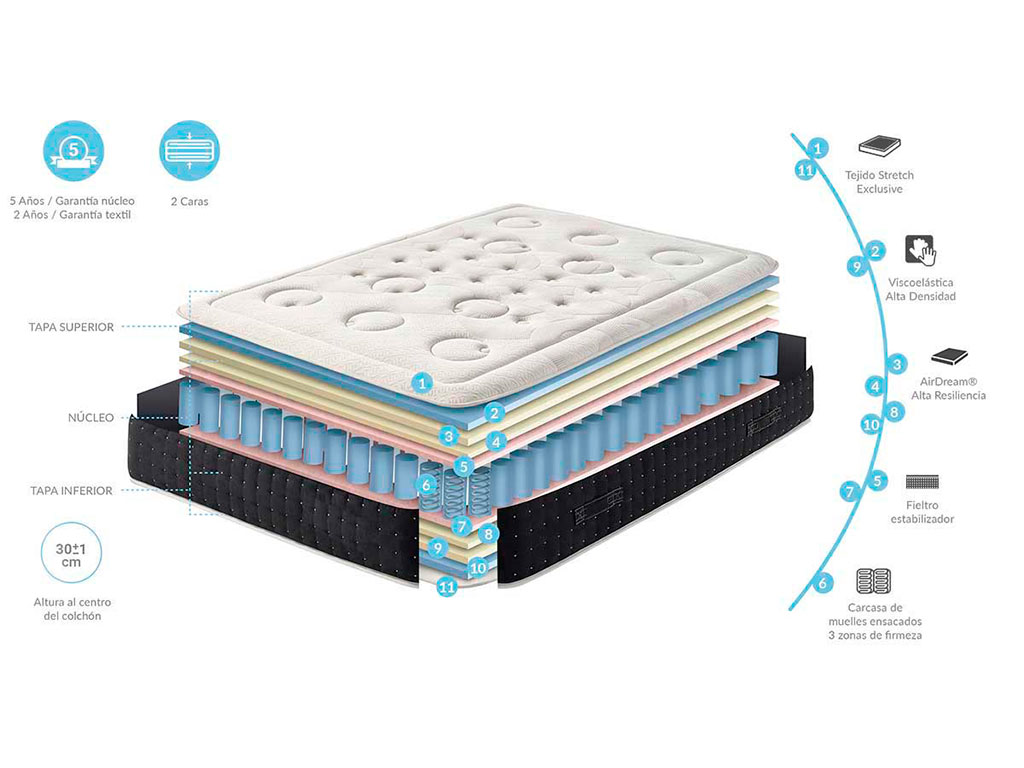 El colchón Tectinium combina las cualidades de los muelles ensacados con material viscoelástico a doble cara. Este colchón ofrece el máximo confort e independencia de lechos para que el descanso sea perfecto.