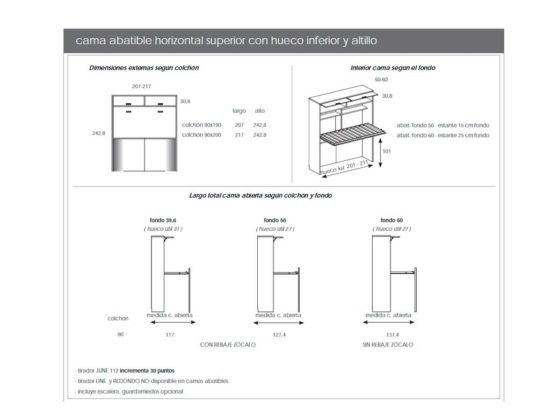 - fondo de 39,6 cm. Medida abierta 117 cm para colchón de 90 cm.(Con rebaje de zócalo).