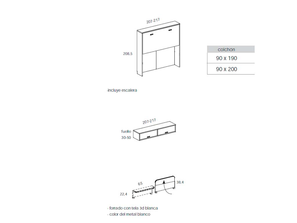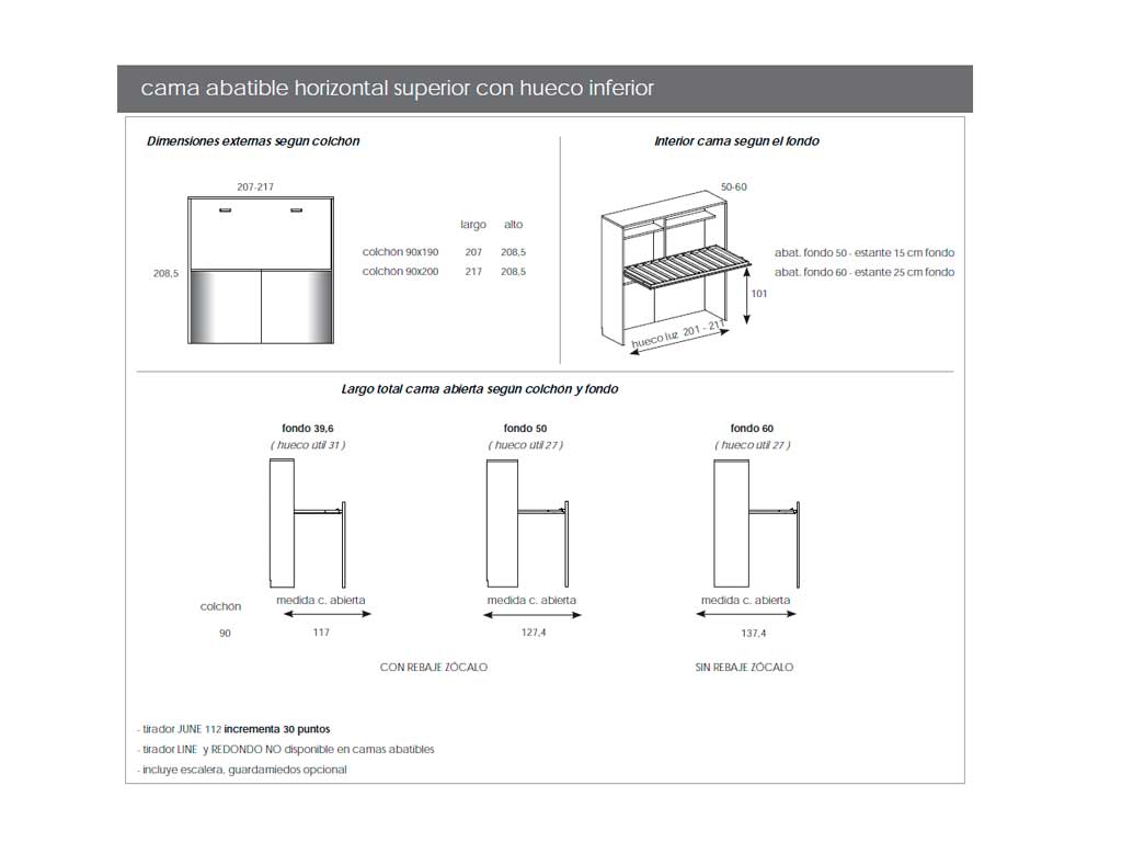 - fondo de 39,6 cm. Medida abierta 117 cm para colchón de 90 cm.(Con rebaje de zócalo).