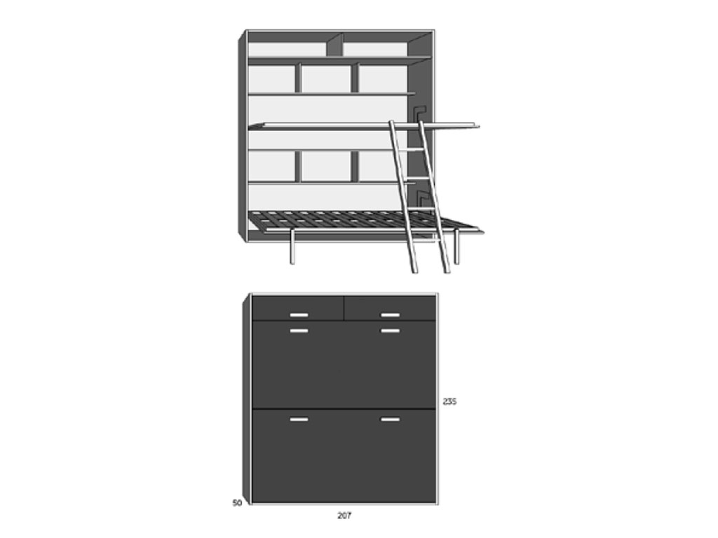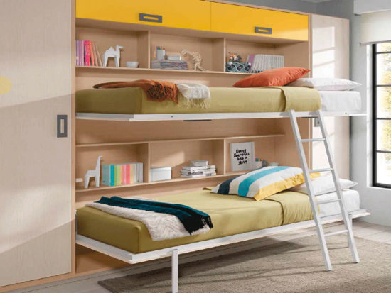 LITERA ABATIBLE CON ALTILLO Y ESTANTES INTERIORES. INCLUYE : BASTIDOR CON SOMIER DE LÁMINAS, CINCHAS SUJETA-COLCHÓN, BARANDILLA DE SEGURIDAD, ESCALERA METÁLICA Y LIBRERÍAS INTERIORES.