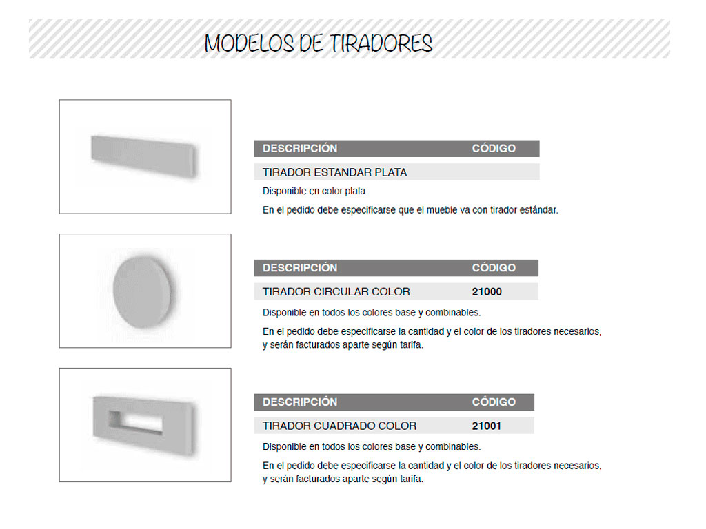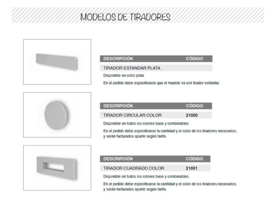 | TIRADORES | TIRADOR PLATA, TIRADOR REDONDO 21000, TIRADOR CUADRADO 21001 |
