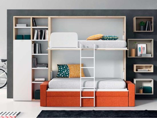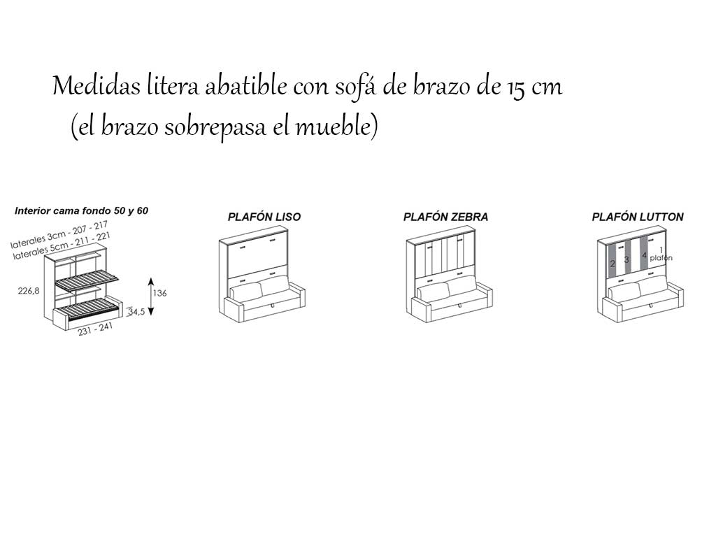 La cama cuando es de profundidad de 60 cm también incorpora en la cabecera un arcón abatible.