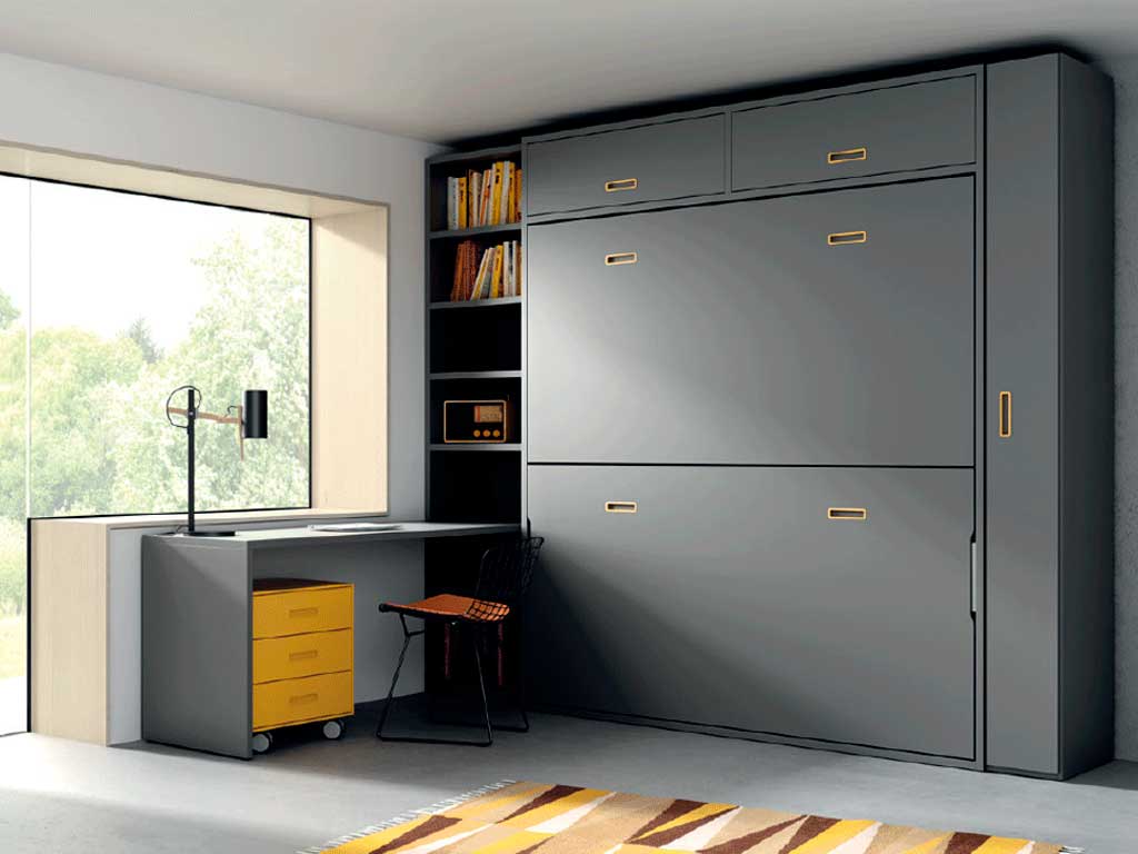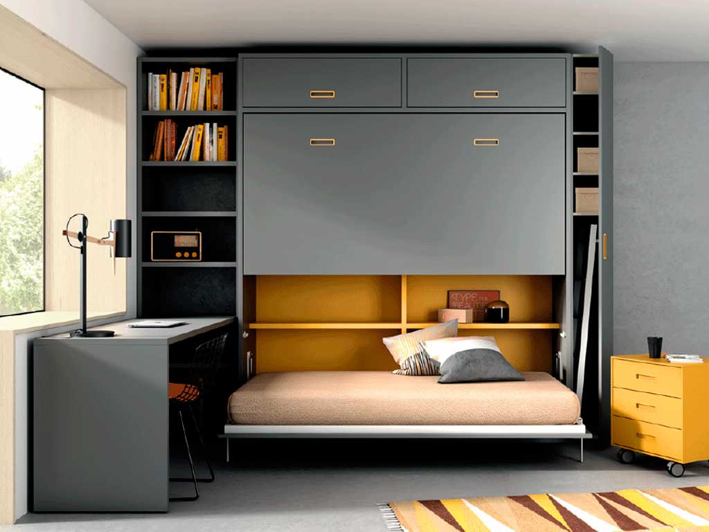Litera abatible con estantería interior incorporada y con altillo. (El precio no incluye: mesa con cajonera, librería y armario lateral).