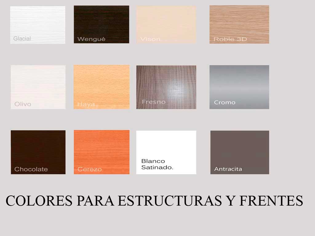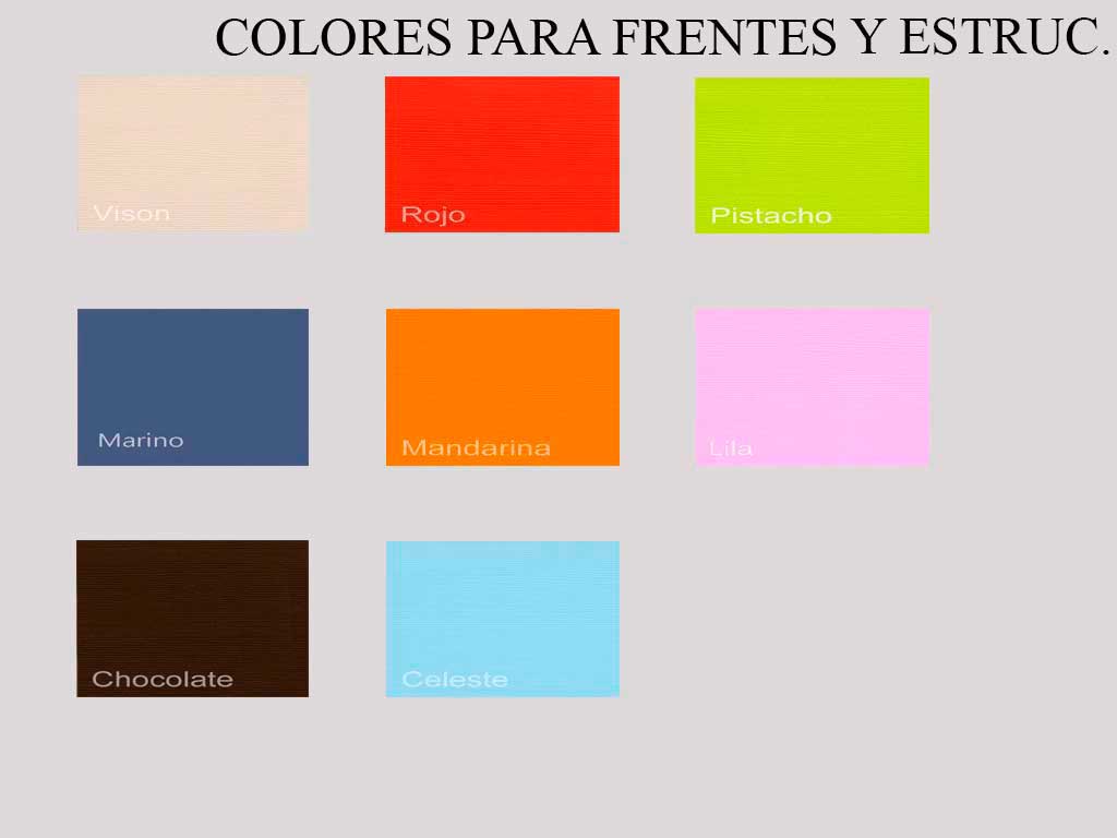 | COLORES MADERA | BLANCO GLACIAL, CELESTE, CHOCOLATE, MARINO, PISTACHO, LILA, MANDARINA, ROJO, VISON, ANTRACITA, BLANCO SATINADO, OLIVO, CROMO, CEREZO, FRESNO, ROBLE 3D, WENGUE, ADVANTAGE |