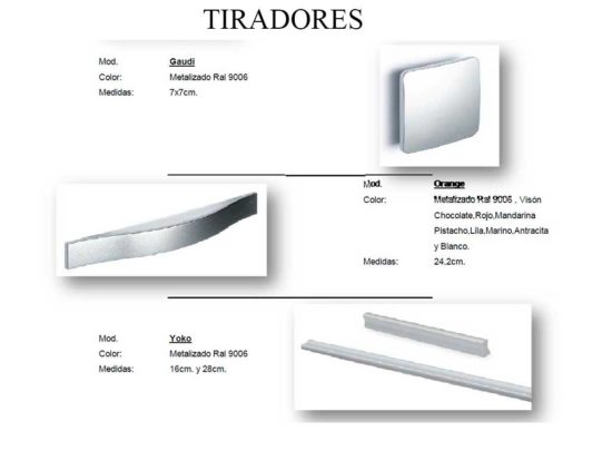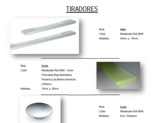 | TIRADORES | SIN TIRADOR, AKER 24 CM, AKER 44 CM, CUÑA 16 CM, CUÑA 80 CM, LUNA, GAUDI, ORANGE, YOKO 16 CM, YOKO 28 CM |