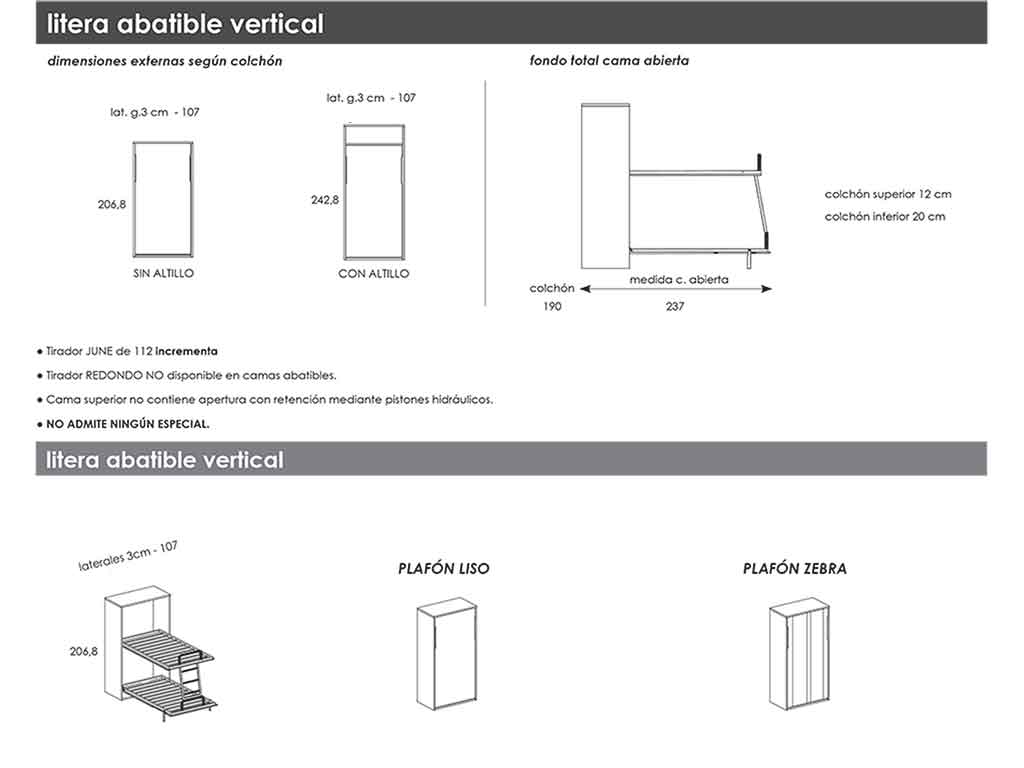 Admite en la cama inferior colchón de 20 cm máximo de grueso y en la cama superior el colchón máximo 12 cm de grueso.