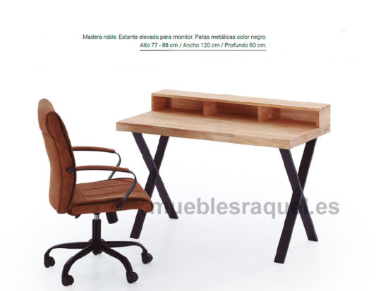 Mesa de madera de roble. Estante elevado para monitor. Patas metálicas color negro.