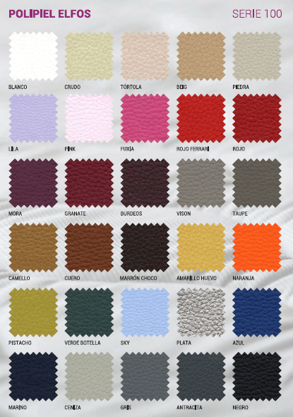 COLORES TAPIZADOS | F.BLANCO, F. BEIG, F.TABACO, F.MARRON, F.MANDARINA, F.ROJO, F.BERENJENA, F.CARDENAL, F.AZUL, F.GRIS, F.NEGRO, P.BLANCO, P.CRUDO, P.TORTOLA, P.BEIG, P.PIEDRA, P.LILA, P.PINK, P.FUXIA, P.ROJO FERRARI, P.ROJO, P.MORA, P.GRANATE, P.BURDEOS, P.VISON, P.TAUPE, P.CAMELLO, P.CUERO, P.MARRON CHOCO, P.AMARILLO HUEVO, P.NARANJA, P.PISTACHO, P.VERDE BOTELLA, P.SKY, P.PLATA, P.AZUL, P.MARINO, P.CENIZA, P.GRIS, P.ANTRACITA, P.NEGRO |
