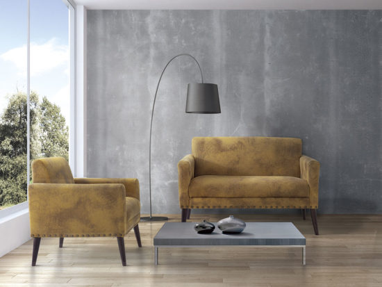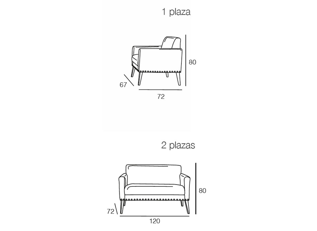 En dos diferente versiones, de una y dos plazas, el modelo VINTAGE, es un elaborado diseño, de cálidas formas rectas y curvas sutiles y armónicas. Sus patas son de madera y todo el perímetro de su base, se ve rodeado de tachuelas.